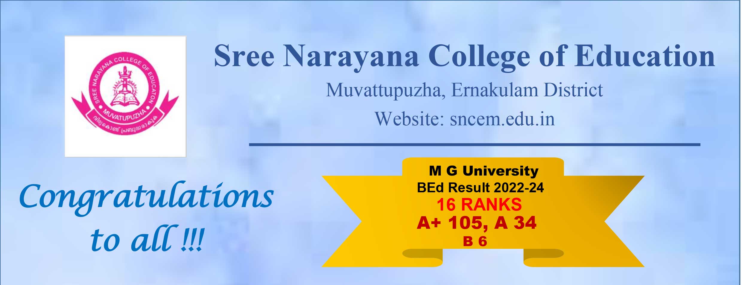 16 Ranks for SNCE BEd 2024 07/06/2024 MG University BEd Results – SNEM Bags 16 Ranks and 105 A+, 34 A and 6 B